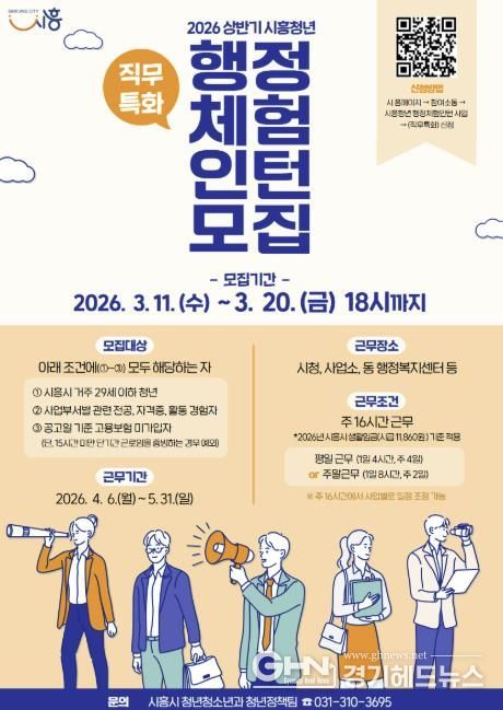 경기헤드뉴스 임채헌 기자 | 시흥시는 지역 청년들의 실질적인 일 경험과 진로 탐색을 지원하기 위해 ‘2026년 (직무특화) 상반기 행정체험 인턴 사업’을 운영하고, 3월 11일부터 20일까지 참여 청년 10명을 모집한다.