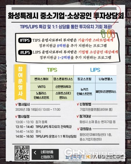 ‘화성특례시 중소기업·소상공인 투자상담회’는 화성시 중소기업 및 소상공인의 투자유치 역량 강화를 지원하기 위해 마련됐으며, TIPS(Tech Incubator Program for Startup) 및 LIPS(Licorn Incubator Program for Small brand) 프로그램을 중심으로 운영된다.