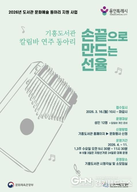 경기헤드뉴스 성미연 기자 | 용인특례시는 ‘2026년 도서관 문화예술 동아리 지원사업’ 공모에 기흥도서관과 수지도서관이 선정, 칼림바 연주 등 3개 동아리를 운영한다고 13일 밝혔다.