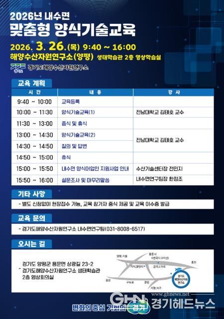 경기헤드뉴스 성미연 기자 | 경기도해양자원연구소는 오는 26일 양평에 있는 연구소 생태학습관에서 내수면 양식 어업인의 역량 강화를 위한 양식기술교육을 실시한다.