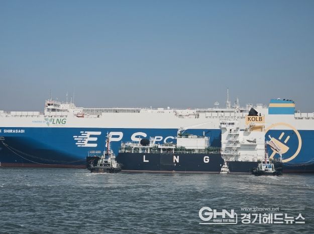 경기헤드뉴스 성미연 기자 | 경기평택항만공사는 18일 평택국제자동차부두에서 개항 이래 최초로 대형 자동차운반선에 1,290톤(Metric Ton) 규모의 친환경 액화천연가스(LNG)를 성공적으로 급유했다고 밝혔다. 이번 첫 시범 운영 성공으로 평택항은 본격적인 상업용 친환경 선박 연료 공급(벙커링) 기반을 마련하며 국제 항만 경쟁력을 한층 끌어올렸다.