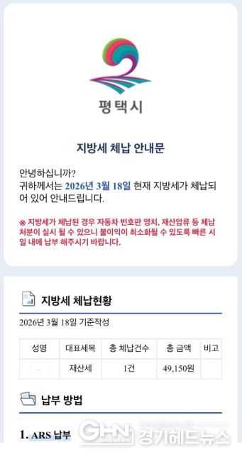경기헤드뉴스 이현규 기자 | 평택시는 ‘모바일 전자고지 시스템’을 활용해 지방세 체납자 1만7천여 명을 대상으로 오는 23일과 24일 이틀 동안 전자문서 형태의 체납안내문을 발송할 예정이다.