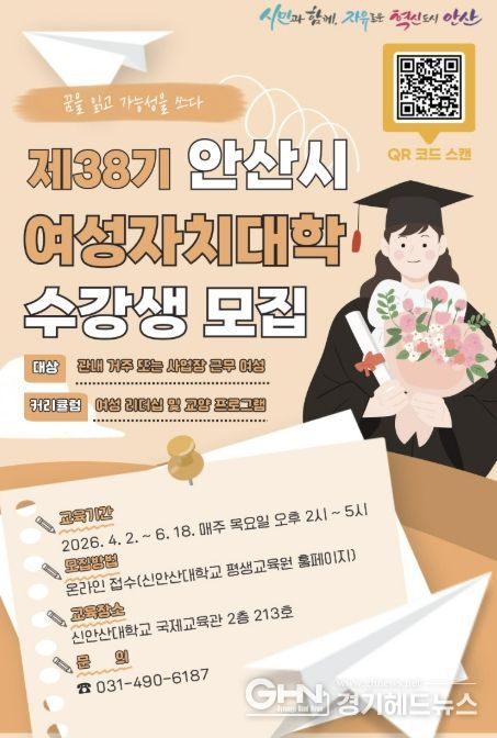 경기헤드뉴스 임채헌 기자 | 안산시는 지역 여성의 역량 강화와 리더십 함양을 위한 ‘제38기 안산시 여성자치대학’ 수강생을 모집한다고 20일 밝혔다.