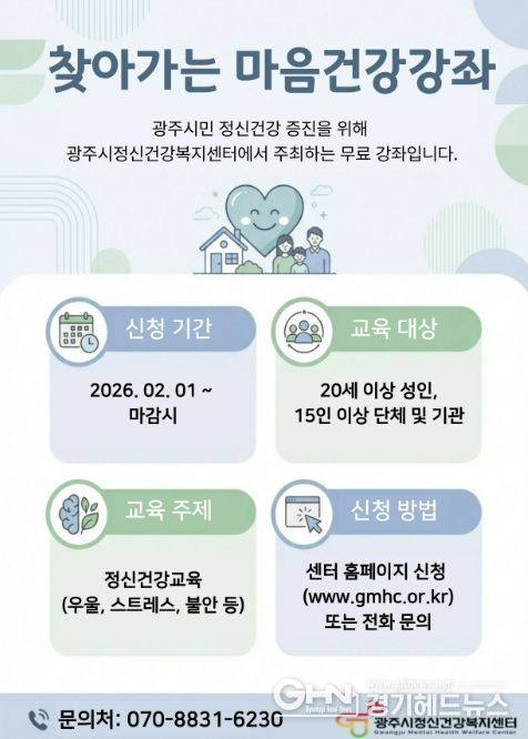 경기헤드뉴스 권민성 기자 | 광주시정신건강복지센터는 지역 내 기관 및 단체를 대상으로 정신건강 인식 향상과 정신질환 예방을 위한 ‘2026년 찾아가는 마음 건강 강좌’를 오는 11월까지 운영한다고 20일 밝혔다.