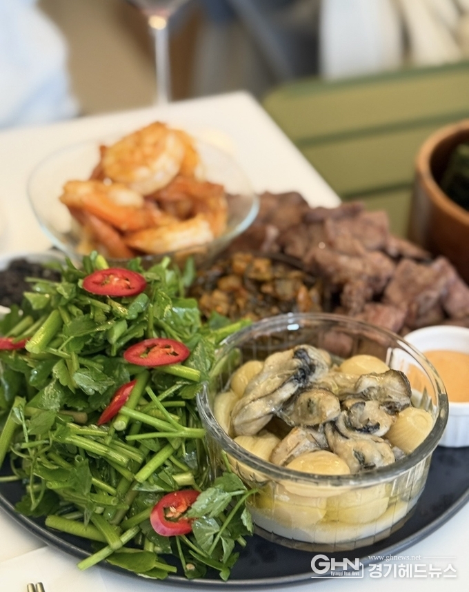 16시간 수비드로 부드럽게 익힌 아롱사태, 담백하게 조리된 해산물, 그리고 미나리무침과 갓김치, 감태김까지. 구성은 다채롭지만 각각이 튀지 않고 하나의 흐름으로 이어진다.