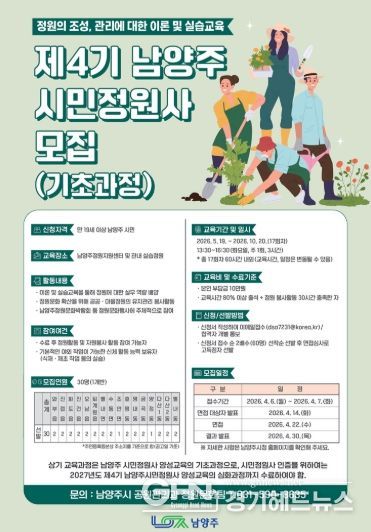경기헤드뉴스 권민성 기자 | 남양주시는 ‘제4기 남양주시민정원사 양성교육(기초과정)’ 참여자를 모집한다고 24일 밝혔다.