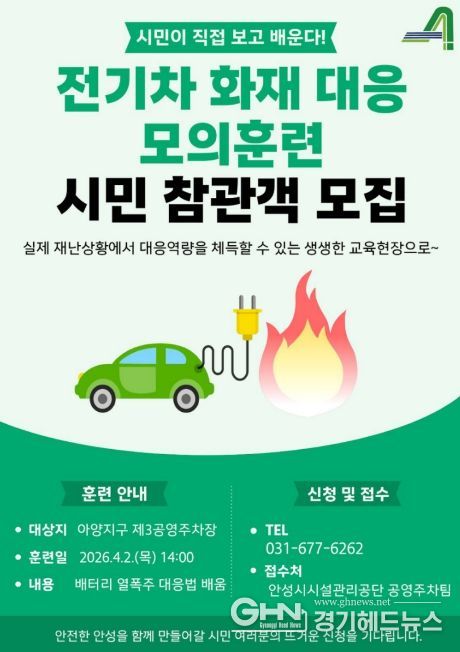 경기헤드뉴스 이현규 기자 | 안성시시설관리공단은 오는 4월 2일 목요일 오후2시 안성시 옥산동 소재 아양지구 제3공영주차장에서 ‘시민과 함께하는 2026년 재난대응 모의훈련’을 실시한다고 밝혔다.