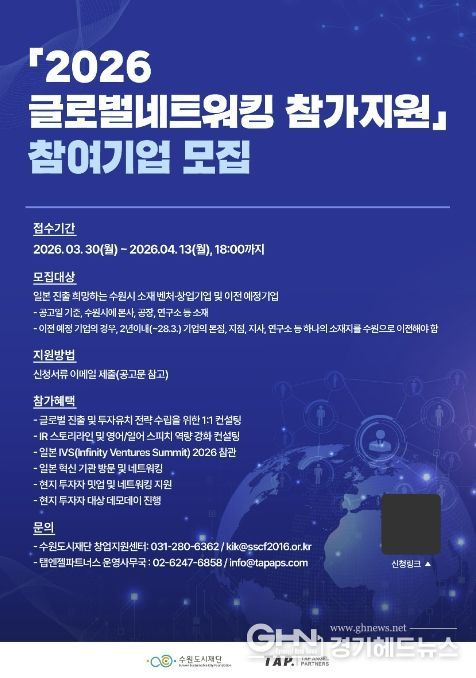 경기헤드뉴스 권준형 기자 | 수원특례시가 ‘2026 글로벌네트워킹 참가지원’에 참여할 벤처·창업 기업 7개사를 3월 30일부터 4월 13일까지 모집한다.