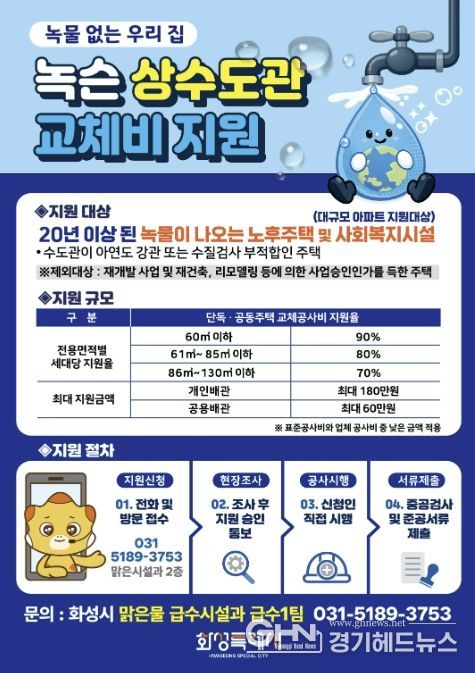 경기헤드뉴스 임수연 기자 | 화성특례시는 쾌적한 주거환경 조성과 안전한 식수 환경 개선을 위해 ‘2026년 녹물 없는 우리집 수도관 개량 지원사업’을 추진한다.