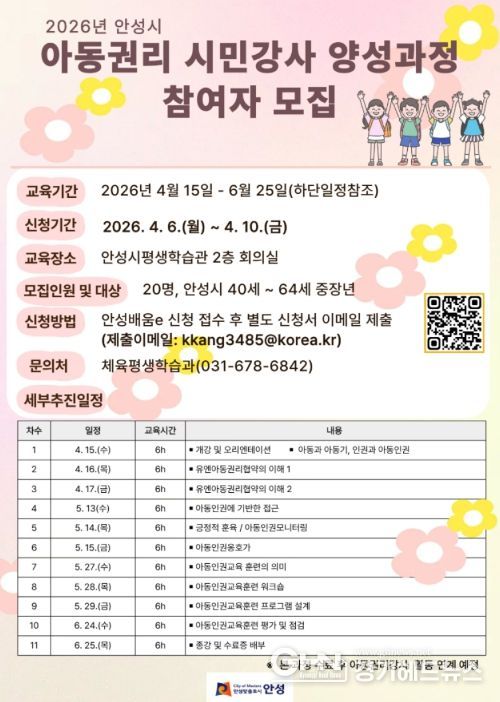 안성시 관계자는 “이번 과정이 중장년층의 새로운 사회참여 기회를 제공하는 동시에, 지역사회에 아동권리 문화가 확산되는 계기가 되기를 기대한다”고 말했다.