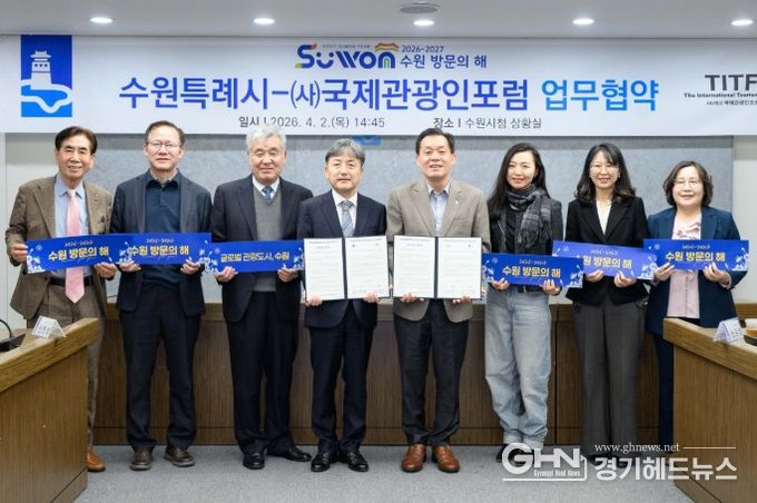수원시와 (사)국제관광인포럼은 2일 시청 상황실에서 업무협약을 체결하고, ‘제5회 세계관광산업콘퍼런스 개최(6월 5일~6일)’와 ‘2026~2027 수원 방문의 해’의 성공적인 추진을 위해 협력하기로 했다.