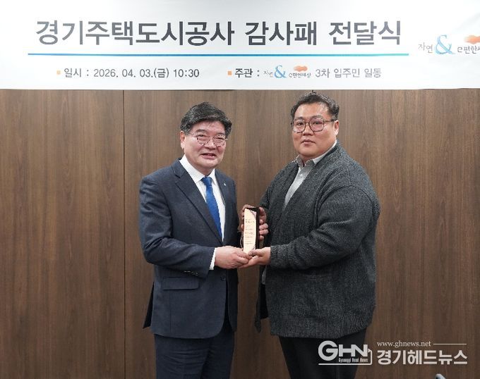 경기헤드뉴스 성미연 기자 | 경기주택도시공사(GH)가 수원 본사에서 다산자연앤이편한세상3차 아파트 입주민들로부터 원활한 조기 분양전환 노력과 제도적 지원에 따른 공로를 인정받아 감사패를 받았다고 3일 밝혔다.
