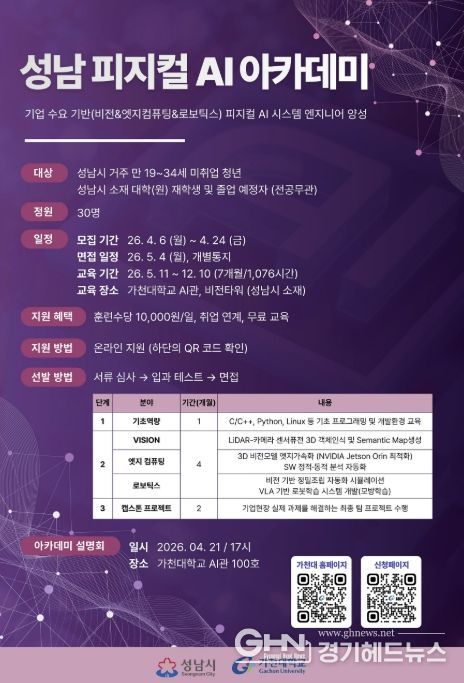 경기헤드뉴스 권준형 기자 | 성남시는 물리 세계와 인공지능(AI)을 결합한 ‘피지컬 인공지능(AI)(Physical AI)’ 분야 핵심 인재를 양성하기 위해 ‘성남 피지컬 인공지능(AI) 아카데미’ 교육생을 4월 24일까지 모집한다.