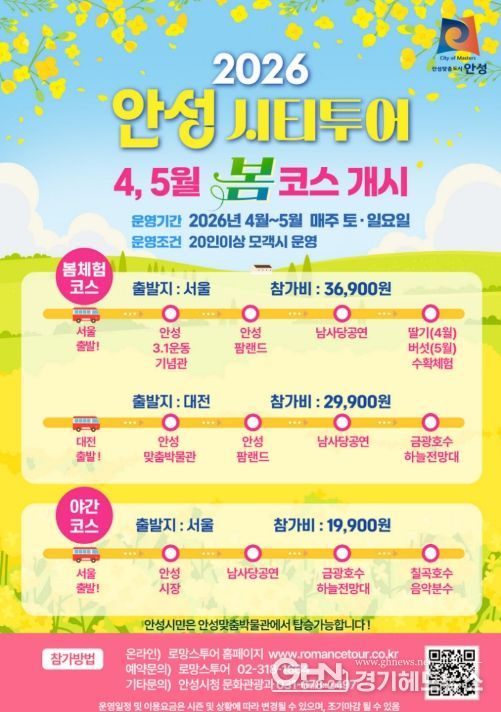 경기헤드뉴스 이현규 기자 | 안성시가 따뜻한 봄을 맞아 관광객들에게 다채로운 체험과 볼거리를 제공하기 위해 ‘2026 안성 시티투어 봄 코스’를 오는 4월부터 5월까지 운영한다.