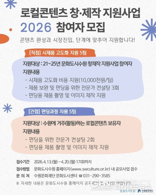 경기헤드뉴스 권준형 기자 | 수원문화재단은 오는 20일까지 지역 고유의 문화자원을 활용한 로컬콘텐츠 발굴과 창작자 육성을 위해 ‘2026 로컬콘텐츠 창·제작 지원사업’을 함께할 참여자를 모집한다.