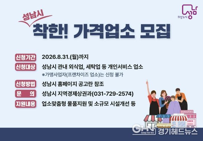 접수는 8월 31일까지 진행되며, 성남시청 홈페이지 공고문을 참고해 시청 지역경제상권과를 방문하거나 이메일 또는 우편으로 신청하면 된다.