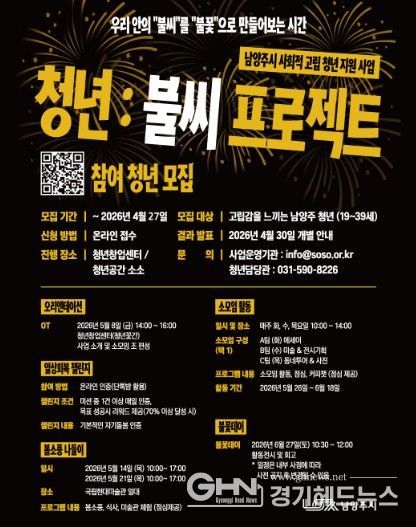 경기헤드뉴스 권민성 기자 | 남양주시는 13일 사회적 고립 청년의 일상 회복과 관계 형성을 지원하는 ‘청년:불씨 프로젝트’ 참여자를 오는 27일까지 모집한다고 밝혔다.