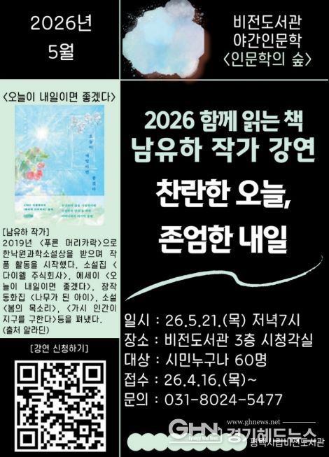 경기헤드뉴스 이현규 기자 | 평택시립 비전도서관은 오는 5월 21일 저녁 7시 남유하 작가를 초청하여 ‘찬란한 오늘, 존엄한 내일’을 주제로 야간 인문학 강연을 진행한다.