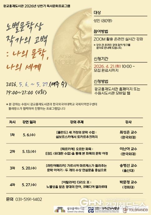 경기헤드뉴스 권준형 기자 | 수원시 광교홍재도서관이 한국외국어대학교와 협력해 진행하는 2026년 세계문화기행 시리즈 1편 ‘노벨문학상 작가의 고백 : 나의 문학, 나의 세계’ 강좌를 수강할 시민을 모집한다.
