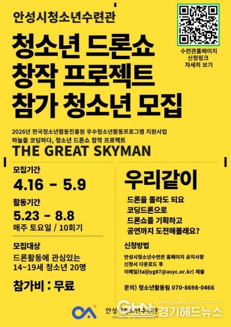 경기헤드뉴스 이현규 기자 | 안성시청소년수련관은 미래 디지털 인재 양성을 위한 청소년 참여형 프로그램 '하늘을 코딩하다, 청소년 드론쇼 창작 프로젝트 ‘THE GREAT SKYMAN’'에 참여할 청소년을 4월 16일 ~ 5월 8일까지 모집한다고 밝혔다.