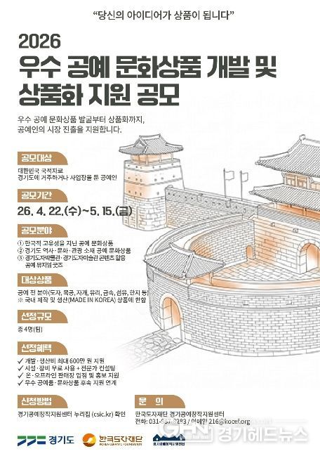경기헤드뉴스 성미연 기자 | 한국도자재단이 ‘2026 공예 문화상품 개발 및 상품화 지원 사업’을 본격 추진한다고 22일 밝혔다.
