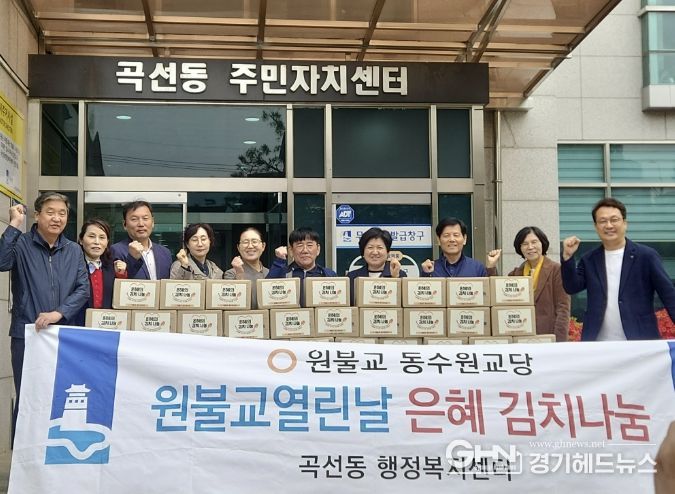 경기헤드뉴스 권준형 기자 | 원불교 동수원교당은 지난 22일 수원시 권선구 곡선동 행정복지센터에서 봄맞이 ‘은혜김치 나눔’ 전달 행사를 개최하고, 정성껏 담근 김치 30박스를 곡선동에 전달했다.