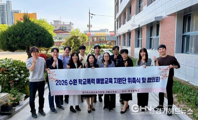 경기헤드뉴스 권준형 기자 | 수원교육지원청은 4월 22일, 23일 양일간‘2026 학교폭력예방 지원단 및 학교폭력 사안처리 현장지원단 위촉식 및 협의회’를 개최했다. 총 23명의 지원단이 위촉장을 받고, 학교폭력 예방 및 학교폭력 사안 처리 대응 체계 구축을 위해 머리를 맞댔다.