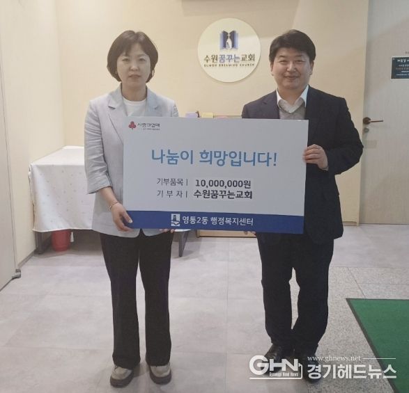 경기헤드뉴스 권준형 기자 | 수원시 영통구 영통2동은 지난 23일 수원꿈꾸는교회가 지역사회 내 취약계층 지원을 위해 교인들과 함께 모금한 사랑의 성금 1천만원을 영통2동 행정복지센터에 기부했다고 밝혔다.