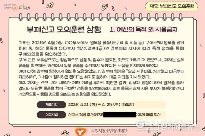 경기헤드뉴스 권준형 기자 | 수원시청소년청년재단은 임직원의 부패 상황 인지 및 신고 역량을 강화하고 조직 내 청렴문화를 확산하기 위해 '2026년 부패신고 모의훈련'을 실시했다고 밝혔다.