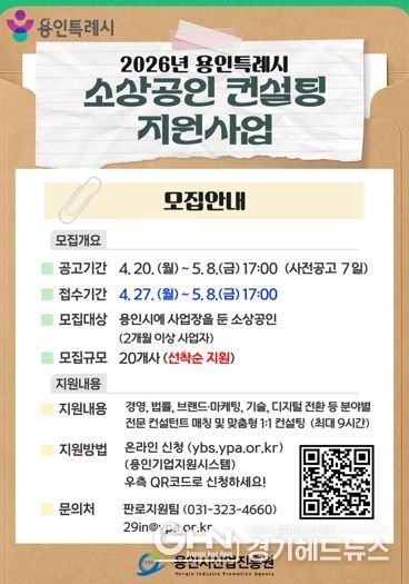 경기헤드뉴스 성미연 기자 | 용인특례시와 용인시산업진흥원은 ‘2026년 용인시 소상공인 창업 및 경영 컨설팅 지원사업’에 참여할 소상공인을 모집한다고 26일 밝혔다.