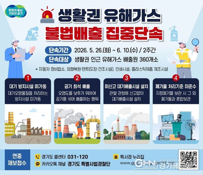 경기헤드뉴스 성미연 기자 | 경기도 특별사법경찰단이 5월 26일부터 6월 10일까지 2주간 주거지·학교·병원 등 생활권 인근 지역의 유해가스 배출 사업장을 대상으로 불법행위를 집중단속 한다.
