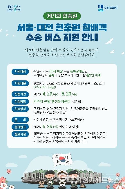 경기헤드뉴스 권준형 기자 | 수원특례시가 제71회 현충일인 6월 6일, 국립현충원(서울·대전)까지 이동이 여의치 않은 국가유공자 유족을 위해 현충원 왕복 수송버스를 운행한다.