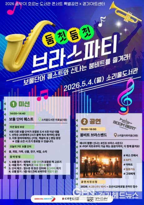 경기헤드뉴스 임수연 기자 | 오산시 소리울도서관은 제104회 어린이날을 앞둔 오는 5월 4일 경기아트센터와 협업해 ‘2026 음악이 흐르는 도서관 콘서트’ 특별공연인 ‘둠칫둠칫 브라스 파티’를 개최한다고 밝혔다.