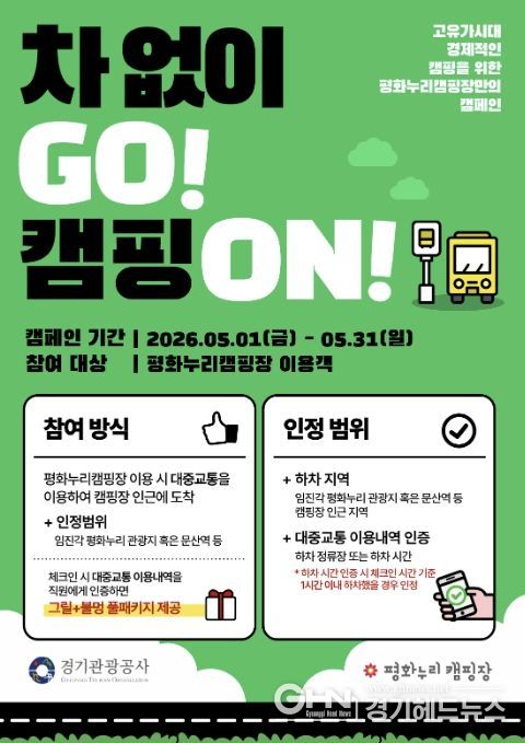 ‘차 없이 GO, 캠핑 ON’는 대중교통을 이용해 캠핑장을 방문하는 고객에게 혜택을 제공하는 캠페인이다. 대중교통 이용 내역을 인증하면 참여할 수 있으며, 참여 고객에게는 그릴과 불멍을 동시에 즐길 수 있는 ‘그릴+불멍 풀패키지’(48,000원 상당) 상품이 제공된다. 대중교통 이용 인정 범위는 문산역 또는 임진각 평화누리 관광지 일원 하차를 기준으로 하며, 이후 캠핑장까지는 도보 또는 택시 이용이 허용된다. 자세한 사항은 평화누리캠핑장 누리집을 통해 확인할 수 있다.