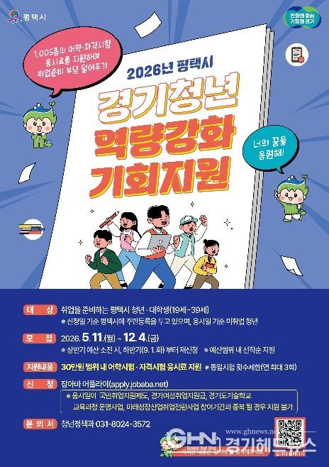 경기헤드뉴스 이현규 기자 | 평택시는 미취업 청년들의 취업 준비 부담을 덜어주고 취업에 필요한 자격 기준을 갖출 수 있는 기회를 마련하여 지속적인 취업 도전 의지를 제고해주는 '경기청년 역량강화 기회지원'사업을 추진한다.