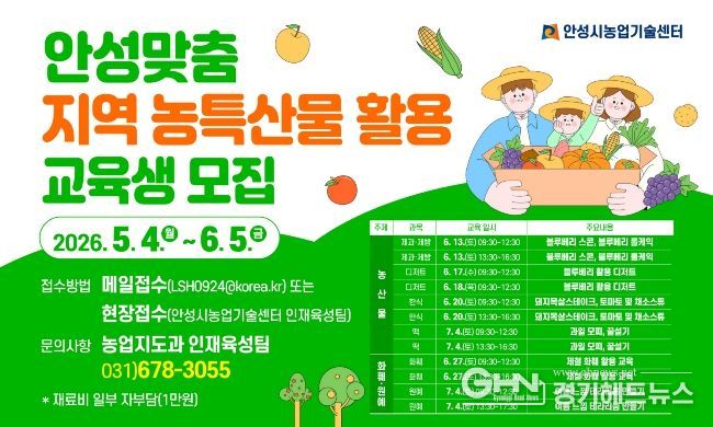 경기헤드뉴스 이현규 기자 | 안성시농업기술센터는 지역 농산물을 활용한 실습 교육을 통해 소비를 촉진하고 ‘지산지소(지역에서 생산된 농산물을 지역에서 소비함)’ 문화를 활성화하고자, 오는 5월 4일부터 6월 5일까지 교육생을 모집한다고 밝혔다.