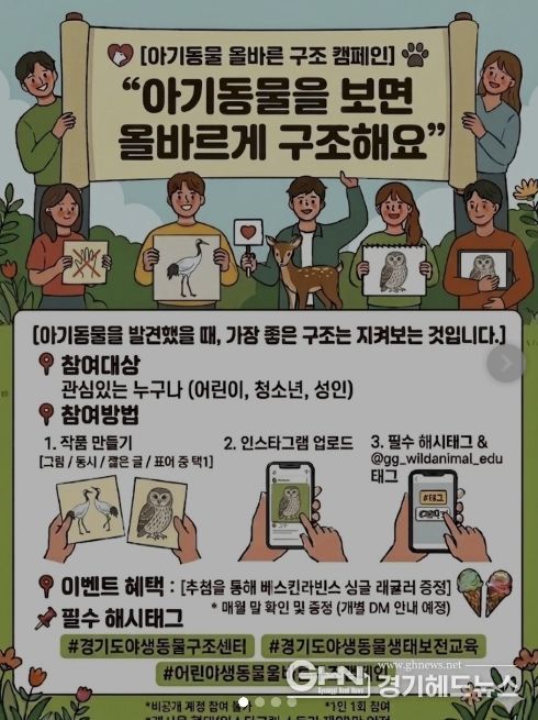 경기도는 어린이를 대상으로 시행하는 ‘야생동물 생태보전교육’에서도 자칫 납치가 될 수 있는 야생동물 구조에 대한 내용을 교육하고 있다. 또 ‘아기동물을 보면 올바르게 구조해요’라는 캠페인을 병행해 미래 세대가 야생동물의 생태적 특성을 이해하고, 인위적 개입을 줄여 자연과 공존하는 삶을 영위할 수 있도록 지속적으로 노력하고 있다.