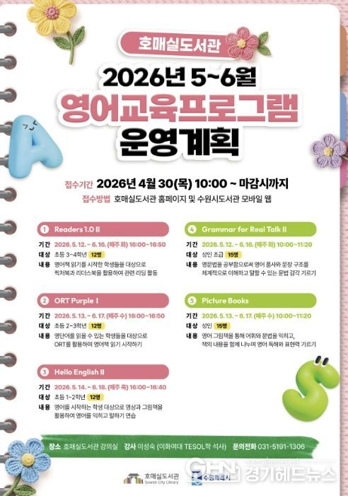 경기헤드뉴스 권준형 기자 | 수원시 호매실도서관이 5~6월 영어교육 프로그램 참가자를 모집한다. 이성숙 강사(이화여대 TESOL학 석사)가 강의한다.