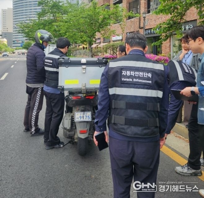 경기헤드뉴스 권준형 기자 | 수원시 영통구는 지난 4월 29일 이의동 연무중사거리 일대에서 수원영통경찰서, 한국교통안전공단과 합동으로 법규위반 이륜자동차를 단속했다고 밝혔다.
