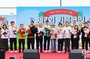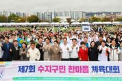 경기헤드뉴스 성미연 기자 | 용인특례시 수지구는 18일 아르피아 상부 체육시설에서 ‘제7회 수지구민 한마음 체육대회’를 개최했다. 수지구 체육연합회가 주최·주관한 이번 대회엔 구민 약 2000여 명이 참여해 승부차기, 볼풀공 바구니농구, 줄다리기, 계주 등으로 구민 모두 한마음으로 어우러지는 시간을 보냈다. 또 식전 공연인 동천동 훌라댄스, 신봉동 밸리댄스와 단국대학교 치어리딩팀 ‘아스테르’의 공연, 퓨전 장구, 보컬그룹 ‘뮤랑’, 마술사 홍승인, 초대 가수 김성환 등이 다채로운 무대를 선보였다. 행사장 곳곳에선 화분 만들기, 친환경 리필스테이션(세제 담아가기), MBTI 검사, 캘리그라피 체험, 키링 만들기, 구민 건강 서비스 안내 부스 등 체험 프로그램이 운영됐다. 이상일 시장은 “우리 수지구민들이 모처럼 한자리에 모여 우정을 나누면서 행사를 통해 행복한 시간을 많이 보내시라고 비가 그친 것 같다”며 “수지중앙공원은 축구장 76개 크기의 시민 힐링 공간으로 조성되고 있고, 상현3동 행정복지센터와 함게 건립되는 광교스포츠센터에는 25m레인 10개의 수영장이 들어서게 된다"며 "서울종합운동장역과 수서역으로 연결되는 경기남부광역철도를 실현하기 위해 많은 노력을