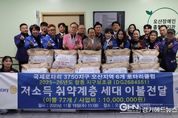경기헤드뉴스 최보영 기자 | 오산장애인종합복지관은 지난 19일 국제로타리 3750지구 오산지역 6개 로타리클럽의 합동 지구보조금 사업을 통해 1,000만 원 상당의 겨울 이불을 후원받아 복지관 세탁지원서비스를 이용하고 있는 장애인 가정에 전달했다고 밝혔다. 이날 전달식에는 국제로타리 3750지구 오산지역 6개 로타리클럽과 오산시자원봉사센터 등 지역 내 관계기관이 함께 참여했다. 후원품은 오산시에 거주하며 세탁지원서비스를 이용하는 장애인 가정 77가구에 전달됐다. 특히 로타리클럽 회원들은 후원품을 단순히 전달하는 데 그치지 않고, 각 가정을 직접 방문해 겨울 이불을 전달하며 안부를 묻고 따뜻한 마음을 나누는 뜻깊은 시간을 가졌다. 성도규 오산장애인종합복지관 관장은 “국제로타리 3750지구 오산지역 6개 로타리클럽의 따뜻한 관심과 후원 덕분에 장애인 가정이 보다 따뜻한 겨울을 보낼 수 있게 됐다”며 “앞으로도 지역사회와 함께 다양한 나눔 활동을 지속적으로 확대해 나가겠다”고 말했다. 오산장애인종합복지관은 앞으로도 장애인 가정의 건강한 일상과 복지 향상을 위해 다양한 지원과 나눔 활동을 이어갈 계획이