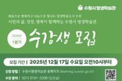 경기헤드뉴스 권준형 기자 | 수원시평생학습관이 12월 17일 오전 10시부터 2026년 1분기 수강생을 모집한다. 1월부터 3월까지 운영되는 1분기 강좌는 ▲첨단미래기술 프로그램 ▲디지털 지식정보 프로그램 ▲생활문화 프로그램 ▲교양 프로그램 ▲인문 프로그램 ▲기관 협력 재능기부 프로그램 ▲거북이공방 프로그램 ▲대상별 맞춤프로그램 ▲시민교육 프로그램 ▲언제든학교 시민기획 프로그램 ▲무지한스승의만남 시민참여기획 프로그램 등 총 11개 과정, 115개 세부 강좌로 구성됐다. 첨단미래 기술 프로그램을 강화했다. 인공지능(AI) 기술에 초점을 둔 첨단미래기술 프로그램, 성균관대학교 지능로봇리빙랩과의 협업을 통한 자율주행 실습, 가상현실(VR)드론 시뮬레이션 체험 등이 있다. 또 글쓰기, 사주명리학, 한글 서예, 현대미술, 명화감상, 뮤지컬 등을 주제로 한 교양 프로그램과 중장년, 시니어, 제2의 인생설계, 청소년 등을 대상으로 하는 대상별 맞춤 프로그램을 마련했다. 수원시는 새빛톡톡 시민 설문조사를 활용해 2026년 강사를 공개 모집했고, ▲생활문화 프로그램 ▲디지털 지식정보 프로그램 ▲대상별 맞춤프로