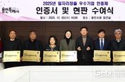 경기헤드뉴스 성미연 기자 | 용인특례시는 3일 본관 4층 전겹실에서 일자리 창출에 힘쓴 지역 우수기업 8곳에 인증서와 현판을 수여했다. 이번에 선정된 기업은 ▲아산디앤씨 주식회사 ▲일승푸드 제2공장 ▲주식회사 에이치에스씨 ▲㈜인실리코젠 ▲주식회사 홈체크 ▲㈜휴먼인텍 ▲케이제이건설산업(주) ▲트루션 등 총 8개사다. 시는 1차 서류심사와 2차 현장실사를 거쳐 일자리 창출 실적, 고용 안정성, 기업의 성장 가능성, 근로환경 등을 종합적으로 평가해 우수기업을 선정했다. 이들 기업은 최근 1년간 총 74명(기업당 4~19명)을 신규 채용해 지역 내 일자리 창출에 기여했다. 또, 다양한 직원복지제도로 근무하기 좋은 환경을 조성해 일자리의 질을 높이는 데 크게 힘쓴 것으로 평가됐다. 이들 기업에는 인증서와 현판이 수여되며, 시가 주최하는 일자리사업, 기업지원사업 참여 시 가점이 주어진다. 일자리박람회 등 채용 행사에도 우선적으로 참여할 수 있다. 용인특례시 일자리창출 우수기업 인증제는 2018년부터 시행되고 있으며, 매년 고용 확대와 일자리 창출에 기여한 기업을 발굴·지원하고 있다