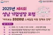 경기헤드뉴스 권준형 기자 | 성남산업진흥원은 '2026년 스케일업 지원 정책'을 주제로 오는 12월 11일 11시 30분부터 2025년 제4회 '성남기업성장포럼'을 개최한다. ‘성남기업성장포럼’은 2024년 9월 첫 포럼 개최 이후, 매회마다 참석자가 증가하여, 지난 10월 제3회 포럼에는 170여명의 기업 임직원과 10여개 기업지원기관이 참여하는 등 성남시 기업 성장을 위한 대표 네트워크로 성장하고 있다. 성남시 소재 기업 임직원은 누구나 포럼 참석이 가능하며, 성남산업진흥원 홈페이지를 통해 참석 신청을 할 수 있다. 이번 포럼에서는 '기업지원 미니설명회'에서 시니어 오너 기업의 엑시트(Exit) 전략에 대한 법무법인 지평의 발표에 이어 창업진흥원과 중소기업기술정보진흥원이 2026년 스케일업 지원방향과 주요 사업을 소개한다. 김윤정 창업진흥원 혁신사업화본부 본부장은 창업 초기단계와 성장단계 기업에 대한 내년도 지원 내용을 설명하고, 차인호 중소기업기술정보진흥원 사업총괄관리실 책임연구원은 중소기업 기술혁신(R&D)을 위한 주요 사업을 안내한다. 또한 성남시 소재 2개사가 자사의 기술
