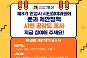 경기헤드뉴스 임수연 기자 | 안성시는 오는 18일 오후 6시까지 시민참여위원회 분과별 제안 정책에 대한 시민 의견을 수렴한다고 밝혔다. 이번 시민 의견 수렴은 시민참여위원회 정책 발표회를 앞두고 진행하는 사전심사로, 분과별 제안 정책에 대한 시민 공감도를 확인하여 추후 현장심사 결과와 함께 최종 우수 제안 정책을 선정하는 데 활용된다. 7개 분과로 구성된 안성시 시민참여위원회는 소속 위원의 다양한 경험과 지속적인 논의를 바탕으로 안성시 시정에 반영할 정책 연구 활동을 추진해 왔으며, 이달 정책 발표회를 통해 각 분과에서 도출한 정책을 제안하여 그간 활동의 결실을 맺을 예정이다. 정책 발표회를 통해 각 분과에서 제안할 정책 주제는 ▲Safety 안성, 시민이 안전한 도시 만들기(공공혁신분과) ▲안성시 평생학습도시에 따른 평생교육 강사 플랫폼 구축(교육특화분과) ▲안성시 한우산업 탄소중립 모니터링 시스템 구축(미래농업분과) ▲안성시민을 위한 태양광발전 5개년 계획(생태도시분과) ▲전통문화 예술인들을 위한 창작공간 확보(문화도시분과) ▲안성, 사랑 흔들바위 관광지 조성(문화도시분과) ▲더불어 이동하는 자유로운 안