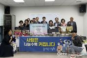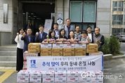 경기헤드뉴스 성미연 기자 | 수원시 영통구 매탄2동 새마을문고은 지난 29일, 추석을 맞아 관내 e편한세상 경로당에 두유, 손톱깎이 세트, 백미 10kg, 커피믹스, 비즈팔찌를 기부했다. 매탄2동 새마을문고는 2024년 9월, 매탄2동 e편한세상아파트 경로당과 정기적 후원 및 자원봉사 연계를 위한 1:1 결연 협약식을 진행했으며, 협약 이후 수차례 경로당에 후원 물품을 기부했다. 이날 매탄2동 새마을문고는 두유, 손톱깎이 세트, 백미10kg, 커피믹스, 비즈팔찌를 기부했으며, 특히 비즈팔찌는 지난 7월, 매탄2동 새마을문고를 방문한 학생들과 만들었던 팔찌라 더욱 의미가 크다. 이인실 새마을문고 회장은 “앞으로도 관내 어르신들께 필요한 사항에 대해 적극적으로 지원하겠으며, 자주 찾아뵙고 지역사회 나눔 분위기를 확산하겠다”고 말했다. 승병숙 매탄2동장은 “정을 나눠주신 새마을문고 회원분들께 감사드리며, 앞으로도 경로당 자매결연 사업이 활성화되어 따뜻한 매탄2동이 되도록 지원을 이어나가겠다”고 전했다.