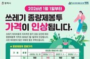 경기헤드뉴스 임수연 기자 | 평택시는 2026년 1월 1일부터 쓰레기 종량제 봉투 가격을 3개년도에 걸쳐 인상한다. 그동안 평택시는 인구증가, 물가상승, 생활 쓰레기 수집 운반 처리비용 증가에도 불구하고 2006년 이후 종량제봉투 가격을 동결해 왔다. 시 관계자는 “현재 평택시의 종량제 가격은 경기도 31개 시군 가운데 최하위 수준이며, 청소예산 재정자립도와 주민부담률이 낮아 가격 인상은 불가피하다”고 밝혔다. 따라서, 대표적으로 일반용 종량제봉투 20리터는 현재 500원에서 110원 인상된 610원으로, 음식물 전용 봉투 1.5리터는 현재 40원에서 20원이 인상된 60원으로, 공동주택에 설치된 음식물종량제기기(RFID)는 1㎏ 단위로 현재 48원에서 12원 인상된 60원으로, 경기도 내 31개 시군 평균 가격을 반영하여 인상안을 마련했다. 다만, 서민경제의 어려움과 시민부담을 고려하여 가격 인상은 3개년도에 걸쳐 단계적으로 시행할 예정으로, 시 관계자는 “종량제봉투 가격 인상에 대한 시민 여러분의 많은 이해와 협조를 부탁드린다”며 “앞으로도 쾌적하고 청결한 도시환경 조성은 물론 질 높은 청소