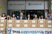 경기헤드뉴스 성미연 기자 | 수원시 장안구 정자3동은 지난 19일, 추석 명절을 앞두고 관내 어려운 이웃들을 위한 이웃돕기 나눔 전달식을 가졌다. 이날 전달식에서 기부된 식료품 꾸러미는 주민자치회 33박스, 통장협의회 17박스, 단체장협의회 10박스로, 전달받은 물품은 관내 기초생활수급자 등 생활이 어려운 가구에 전달될 예정이다. 이판수 주민자치회장은 “추석을 맞아 우리 이웃이 풍요로운 한가위를 보내는 데 도움이 될 수 있도록 앞으로도 각 단체 회원들이 앞장서겠다.”고 말했다. 송근숙 정자3동장은 “어려운 이웃을 위해 나눔의 손길을 내밀어주셔서 깊은 감사의 말씀을 전한다”며, “지원해주신 물품은 도움이 필요한 분들에게 잘 전달될 수 있도록 세심히 살피겠다”고 전했다.