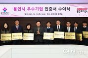 경기헤드뉴스 성미연 기자 | 용인특례시는 11일 시청 접견실에서 ‘2025년 용인시 우수기업 인증제’ 심의 결과 선정된 ‘올해의 우수기업’ 10개 사에 인증서를 전달했다. 이상일 용인특례시장은 이들 기업 대표와 임직원들을 만나 축하와 격려 인사를 나누고 우수기업 인증서와 현판을 전달했다. 이상일 시장은 “우리 경제가 어려운 가운데서도 기업 활동을 잘 해주셔서 우수기업으로 선정된 것을 축하드린다”며 “각자 분야에서 그동안 많은 노하우를 쌓아왔기에 경제가 어려운 가운데서도 성과를 냈고, 우리 지역 경제에도 큰 보탬이 돼 주셔서 감사드린다”고 말했다. 이 시장은 “기업 활동으로 한 가족의 가장은 힘을 얻어 가정을 잘 꾸려갈 수 있고, 신규 일자리를 찾는 사람에게는 희망을 주셨다”며 “기업인들이 활동하실 수 있도록 환경을 잘 개선해 나갈 것”이라고 했다. 시는 매년 경영 실적, 기술·품질 경쟁력, 지역사회 기여도 등 다양한 지표를 종합 평가해 지역경제 발전에 기여한 중소기업을 우수기업으로 인증하고 있다. 올해 선정된 기업은 ▲㈜대성티엠씨 ▲신명이엔씨㈜ ▲주식회사 에이드로 ▲㈜에이치에스씨엠티